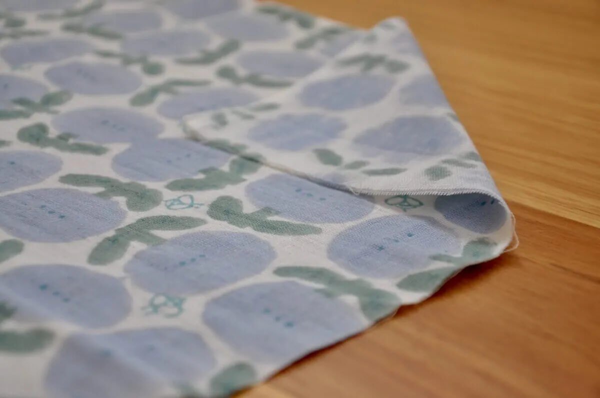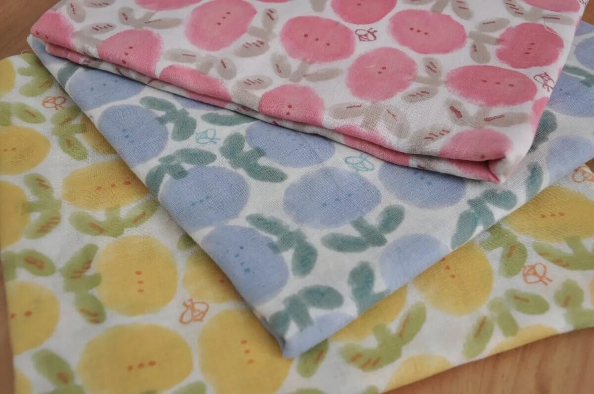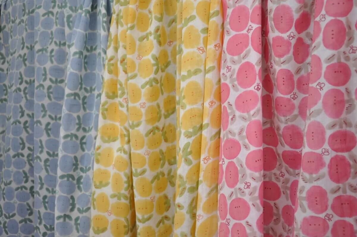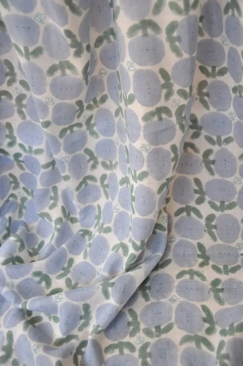 This fabric is designed by Chiharu in Tokyo and then handprinted by artisans in India, using a hand carved woodblock for each colour and layer in the design – resulting in a beautiful gentle texture. Every piece of fabric is one of a kind.
