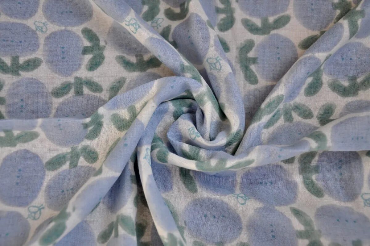 Honey Blue in breezy double gauze, by Japanese indie designer, admi. Honey shows of beautifully rounded blooms with bees buzzing amongst them.