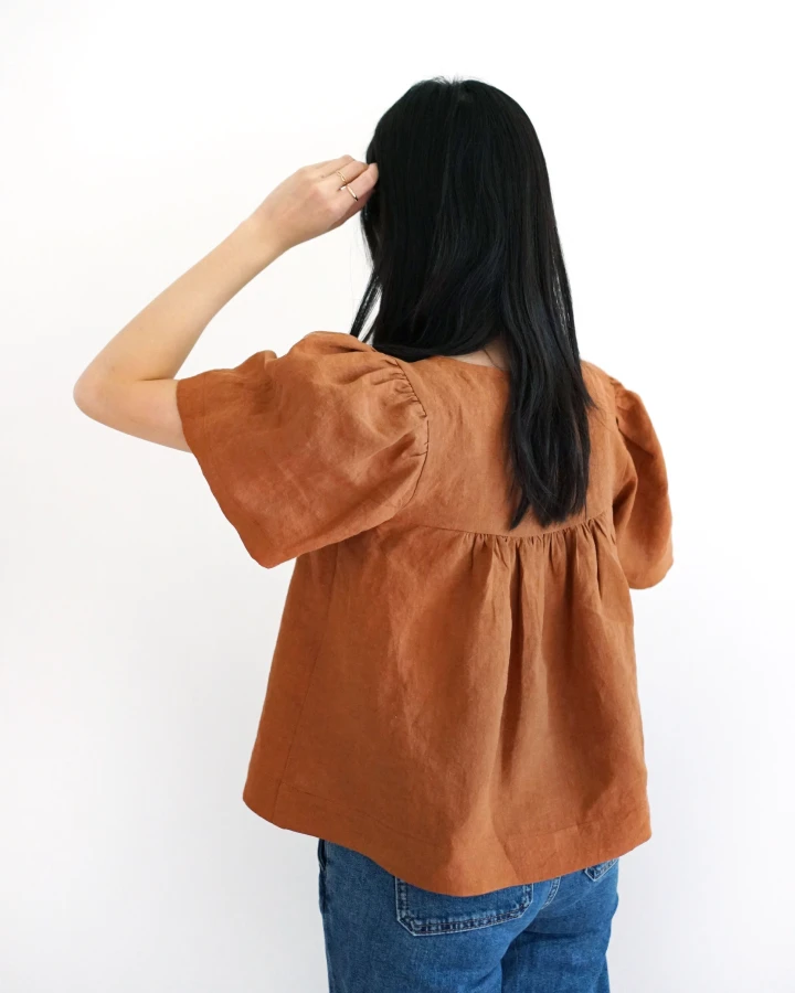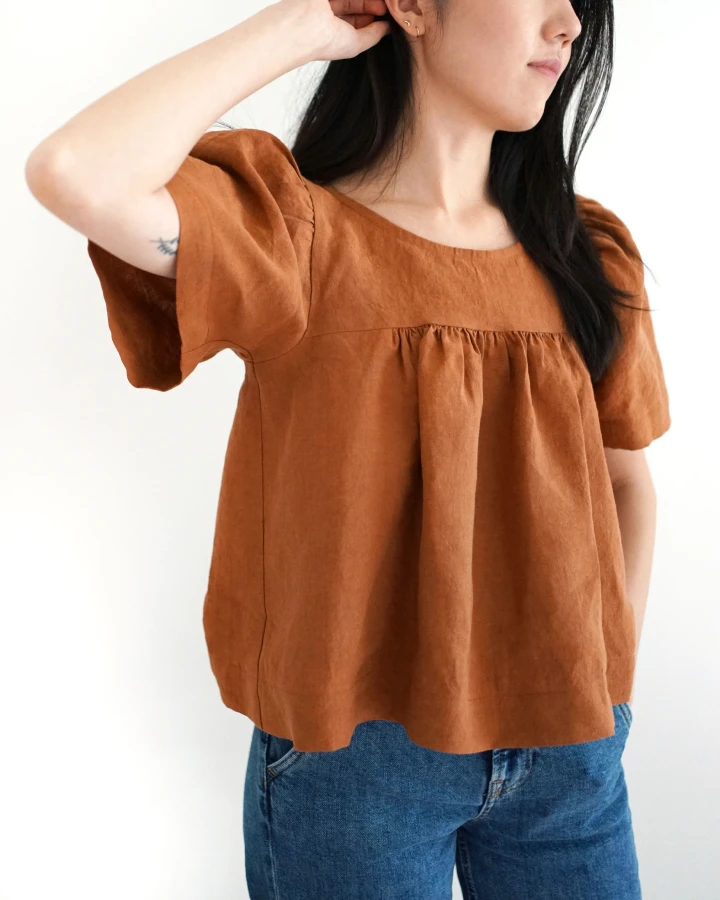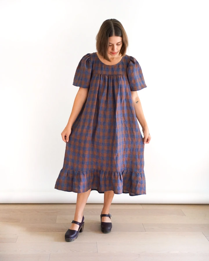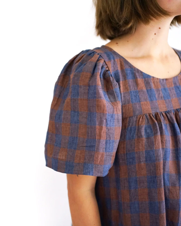 The Champagne Field Dress is designed for light to midweight woven fabrics. For a crisp, structured silhouette, choose cotton shirting, lightweight twill, or linen blends. For a softer, more relaxed drape, opt for washed linen, lightweight cotton, or other breathable woven fabrics with movement. When sewing patchwork, use fabrics with similar weights to ensure even gathers and a balanced finish.