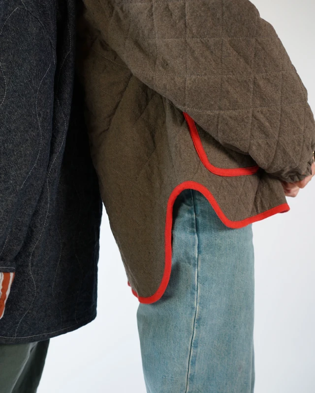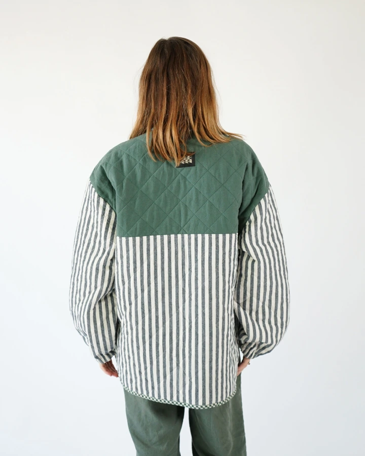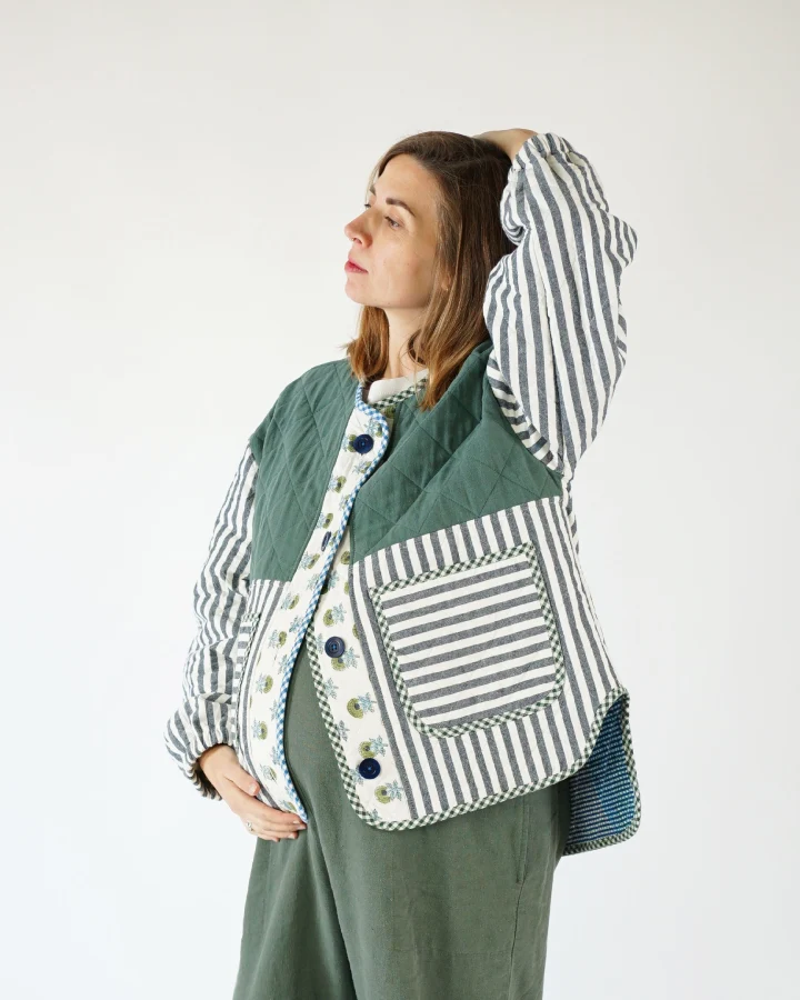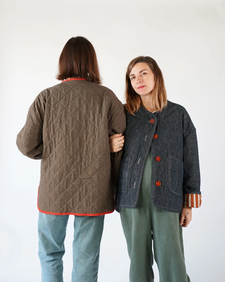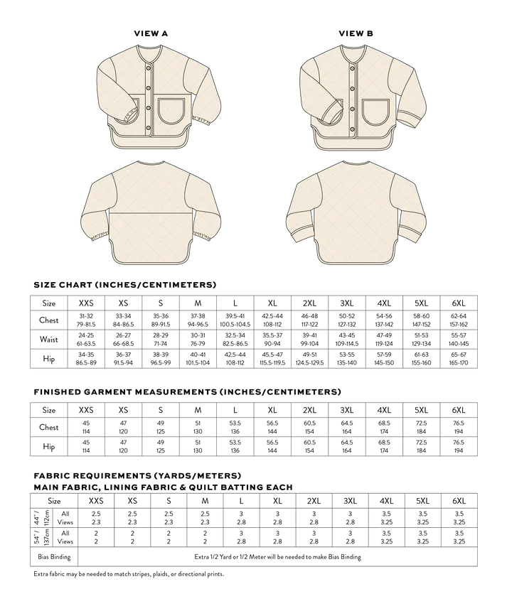 The Homebody Quilted Jacket is designed for light to medium weight woven fabrics like quilting cottons, linen, and blends. Suitable fabrics include cotton, linen, twill, denim, and canvas.