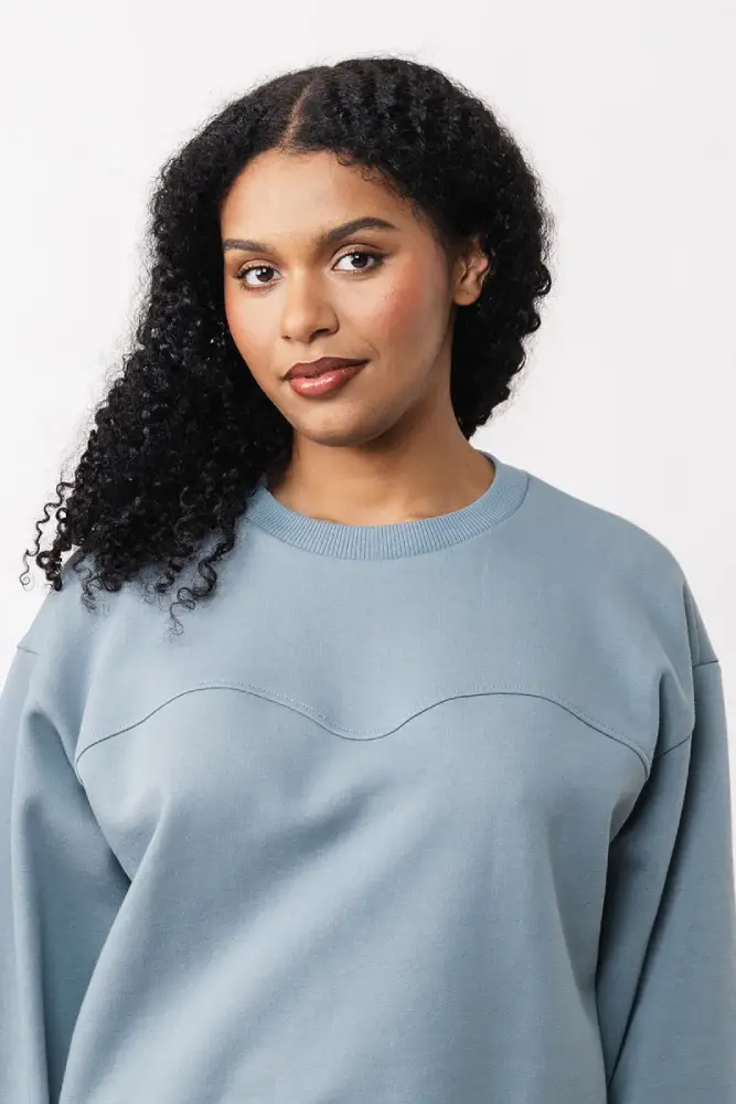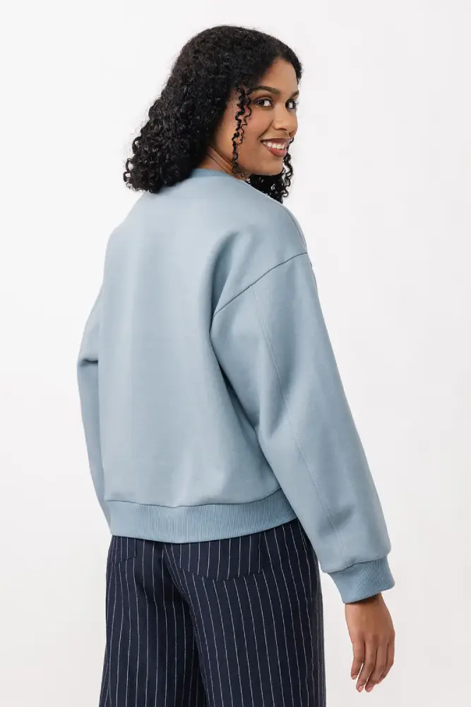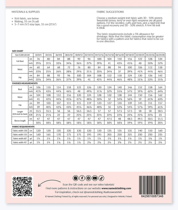 Choose a medium weight knit fabric with 30 – 50% stretch. Sweatshirt jersey, terry or even light neoprene are all good options. For the neckline, cuffs and hem, pick a rigid knit that has a good recovery and 30 – 50% stretch.