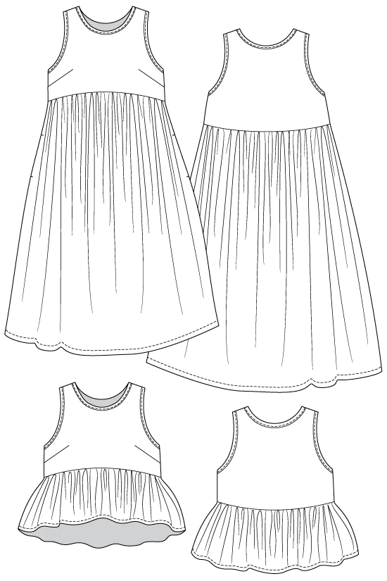 Both variations feature a voluminous, gathered hem, and a round neckline and armholes that are finished with binding.