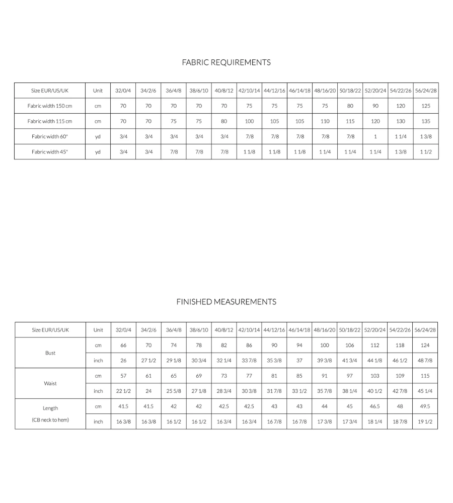 Note: For patterned or napped fabrics, the fabric requirement may be higher.